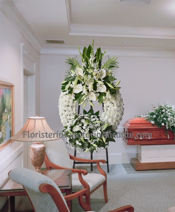 En Floristeria Tanatorio Alicante contamos con una de las Coronas Funerarias mas fina y elegante como la Corona Funeraria Clavel Suprema Blanca, realizada con gran delicadeza y haciendo uso de la mejor calidad de Flores para Funeral, en este caso cuenta con dos cabezales, los dos formados por flor blanca al igual que el aro de claveles blancos, lo que da una sensación de pureza, en nuestra Floristeria Tanatorio siempre contamos con gente que tiene gran experiencia en el sector de Arreglos Funerarios y se encargan de hacer envíos urgentes a todos los tanatorios de la provincia de Alicante, pero si desea tambien puede enviarlo a un domicilio o cualquier centro de culto.