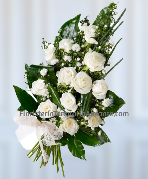 Este ramo floral funerario consta de 12 rosas blancas que lo convierten en un ramo fino y bonito. Además, también se compone por flores pequeñas de relleno y elegantes verdes variados, como la aspidistra. Son perfectos para entregar en los Tanatorios de Alicante.